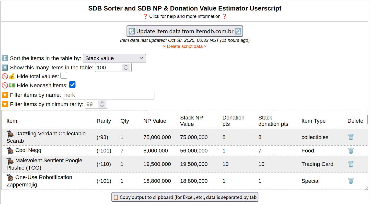 Log SDB pages and display data in a table, sortable by value, qty, and more. Item info retrieved from and used with permission by itemdb.com.br
