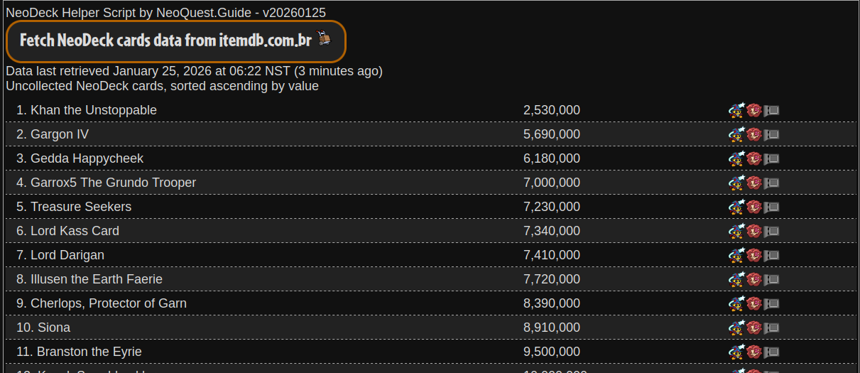 View your NeoDeck page (https://www.neopets.com/games/neodeck/index.phtml?owner=YOURUSERNAME&show=cards) to see a list of uncollected cards, sorted by value. Data from itemdb.com.br