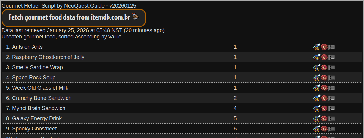 Officially, The Neopets Team does not allow userscripts. In practice, TNT accepts that the community uses them as long as they do not automate, bot, or cheat. Safe examples: filling in the Wishing Well input or logging random events. Unsafe examples: auto-buying or shop-highlighting. These scripts below are, in my opinion, safe to use and acceptable by community standards. Use at your own risk.